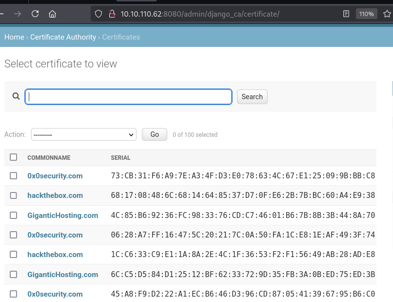 Jungle Admin后,能看到有一个证书管理(Certificate Manager) 界面。可见它被用于统一管理多个站点的 SSL 证书(例如gigantic hosting、HTB、0x0security等证书都在此平台管理)。除此之外暂时还没看到更多敏感功能。