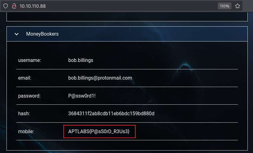 将这些重要信息拿出来做细致的分析keyboard_arrow_rightEdaboard username: email: bob@live.com password: P@ssw0rd1! hash: 3684311f2ab8cdb11eb6bdc159bd880d mobile: +90 432 652 14 13 keyboard_arrow_rightGoGames username: Junglelee email: kim.stone@protonmail.com password: P@ssw0rd1! hash: 3684311f2ab8cdb11eb6bdc159bd880d mobile: +90 653 111 67 35 keyboard_arrow_rightLinuxForums username: linuxrobert email: robert@0x0security.com password: iL0v3l!nux hash: d8f40ecca9c23d665cb86579ab62c586 mobile: +90 921 525 87 74 keyboard_arrow_rightLupaWorld username: khalifaLife email: jim.khalifa@hotmail.com password: P@ssw0rd1! hash: 3684311f2ab8cdb11eb6bdc159bd880d mobile: keyboard_arrow_rightMoneyBookers username: bob.billings email: bob.billings@protonmail.com password: P@ssw0rd1! hash: 3684311f2ab8cdb11eb6bdc159bd880d mobile: APTLABS{P@sS0rD_R3Us3} keyboard_arrow_rightcollection1 username: mak email: mark@0x0security.com password: $Ul3S@t0x0S3c hash: 35aaa279711af9353dcd8f2e5c22b86b mobile: +90 433 794 13 53 keyboard_arrow_rightgigantichosting username: bob email: bob@gigantichosting.com password: P@ssw0rd1! hash: 3684311f2ab8cdb11eb6bdc159bd880d mobile: +90 763 995 34 55首先,经过我们前期的信息收集从10.10.110.231哪里获取到了这个公司内部分角色的职位和邮箱信息
