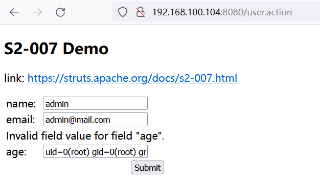 </validators>当用户提交 age 为字符串而非整形数值时,后端用代码拼接 "'" + value + "'" 然后对其进行 OGNL 表达式解析。要成功利用,只需要找到一个配置了类似验证规则的表单字段使之转换出错,借助类似 SQL注入单引号拼接的方式即可注入任意 OGNL 表达式。