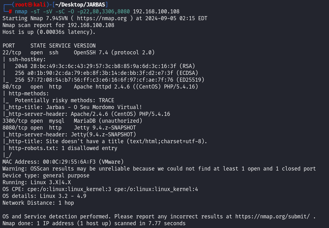 nmap -sT -sV -sC -O -p21,22,80,3306 192.168.100.108