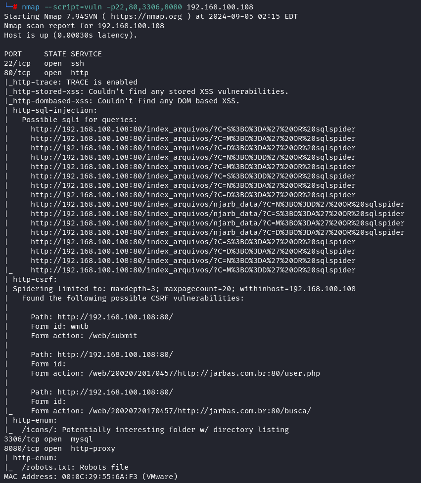 nmap --script=vuln -p21,22,80,3306 192.168.100.108