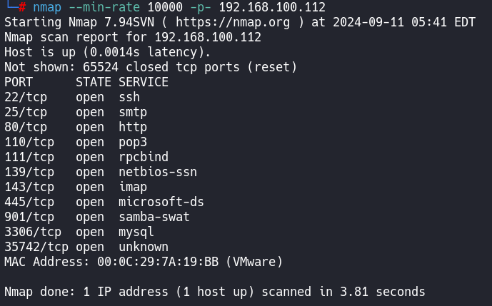 └─# nmap --script=vuln -p22,25,80,110,111,139,143,445,901,3306,35742 192.168.100.112