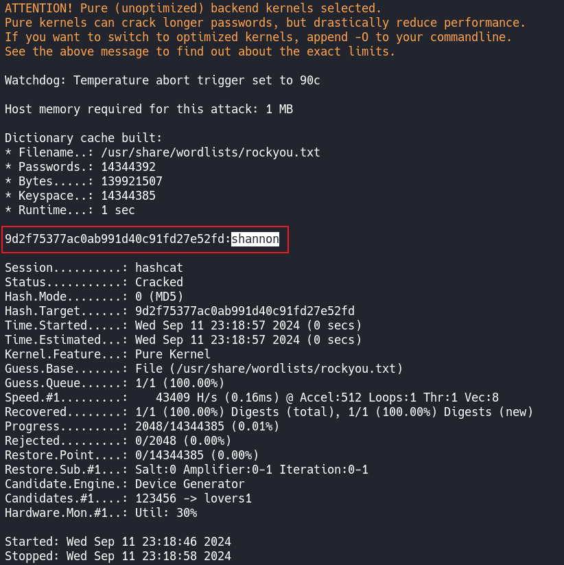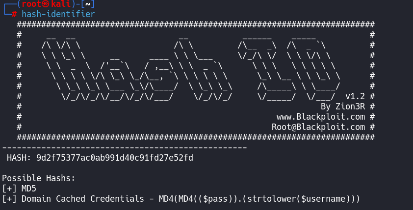 hashcat -m 0 -a 0 9d2f75377ac0ab991d40c91fd27e52fd /usr/share/wordlists/rockyou.txt