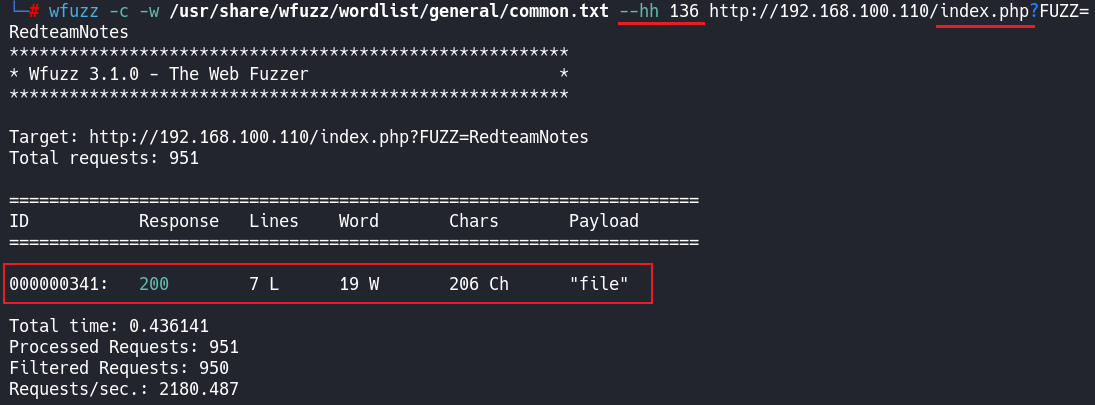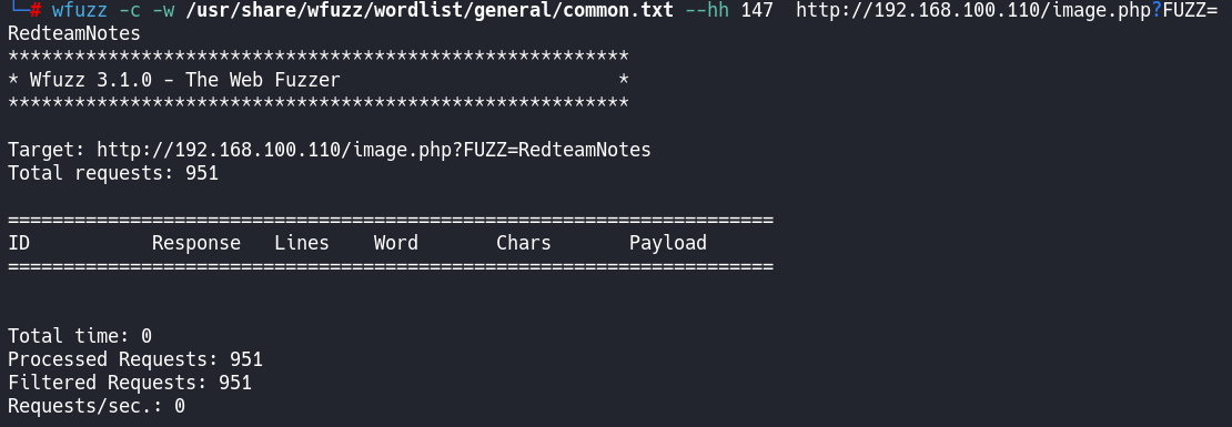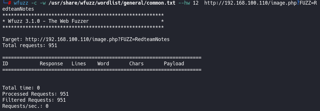 wfuzz -c -w /usr/share/wfuzz/wordlist/general/common.txt http://192.168.100.110/image.php?FUZZ=RedteamNotes└─# wfuzz -c -w /usr/share/wfuzz/wordlist/general/common.txt http://192.168.100.110/image.php?FUZZ=RedteamNotes