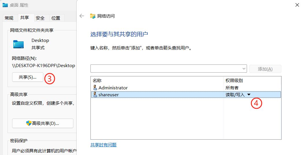 # 创建用户 # net user shareuser 123123 /add # 命令成功完成 # 把该用户加入“管理员组” net localgroup administrators shareuser /add # 查看用户是否创建成功 net user shareuser